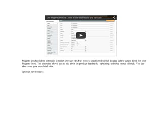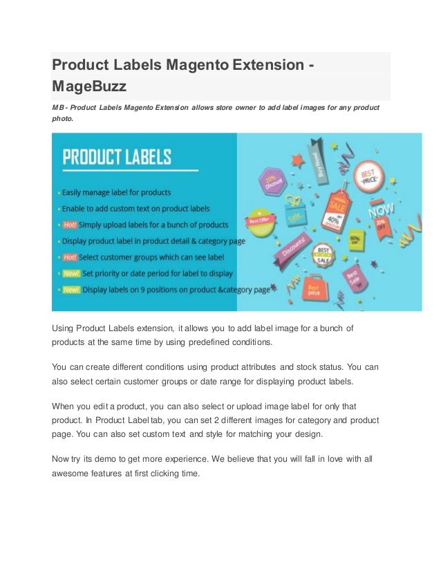 Magento Product Labels - Sticker For On Sale, Special Price… Magento Product labels extension allows you to put promotional stickers on your products that instantly communicate an 'on sales', discount or any other customized message to your valued customers. You can add text to the product image for further understanding of Magento labels.